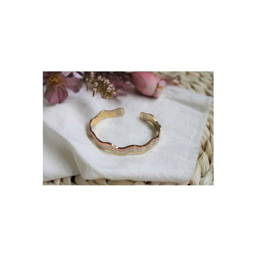 Bracelet ajustable composé de cuivre et de deux aimants. Sa forme de jonc ondulé permet de s'adapter à tous les poignets et de bénéficier des bienfaits du cuivre et des aimants au quotidien.
